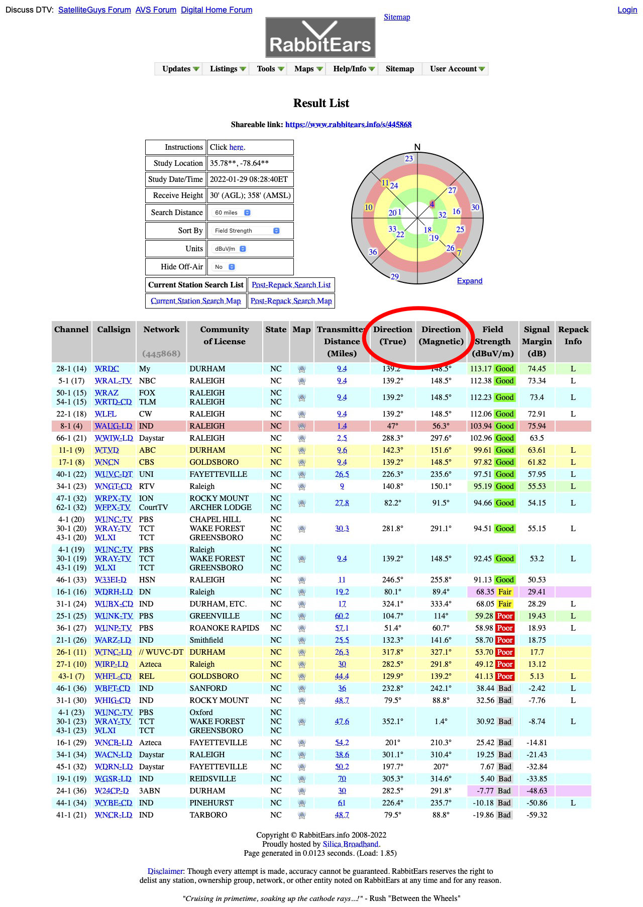 Importantly, they also show you the direction of the towers. If you click the image on the left (or above), you’ll see just how much information you get from RabbitEars.info, but for now, we’re only looking for the direction of the towers - which I’ve circled. RabbitEars.info shows both the “true” direction and the “magnetic” direction.